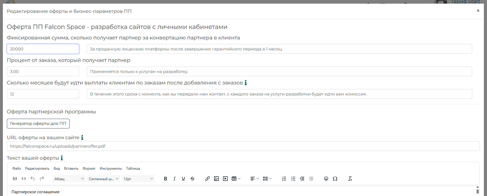 3. Создать оферту ПП - юридическое соглашение между вами и партнерами, которое регулирует взаимодействие по ПП. В Сервисе есть генератор оферты со вставкой ваших данных.