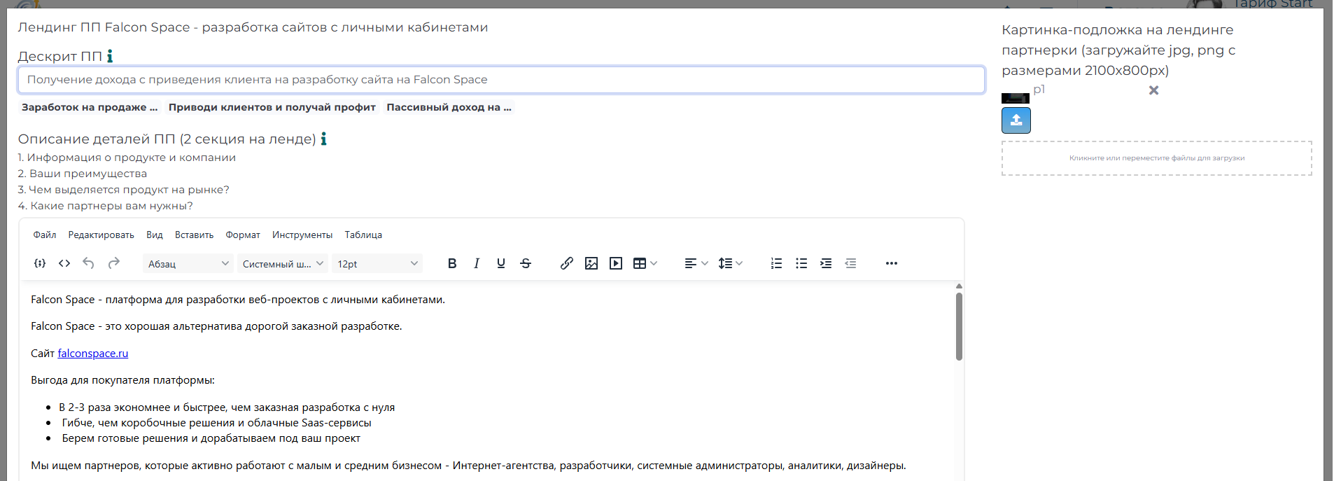 5. Указать информацию для партнеров, которые уже согласились работать по ПП - загрузить материалы и текст с описанием что делать партнеру после подключения к ПП.