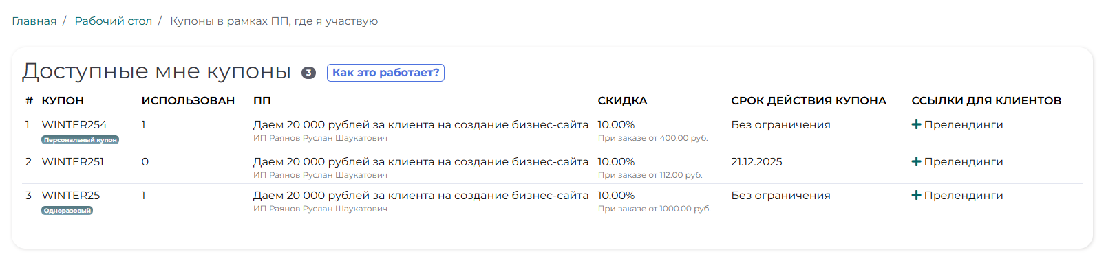 2. Партнер в своем ЛК видит все доступные ему купоны на странице Купоны (/coupons).